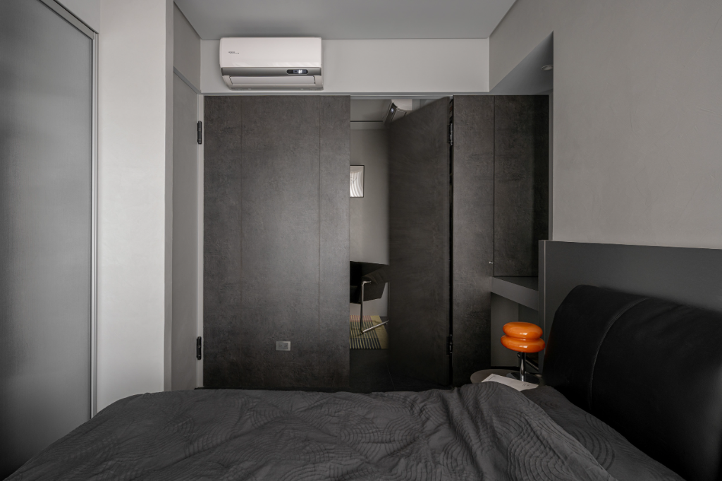 面積約18坪的標準大樓單位,原為三房一廳格局,設計師打破既定配置,拆除一房以釋放公領域尺度,使客廳與廚房得以舒展連貫;主臥室與另一房間則以雙通道暗門分隔,一間為臥房,一間兼具更衣與次臥室功能。設計師更巧妙透過指紋鎖裝置,強化空間之間的獨立性與私密感,讓自由動線與展間感生活體驗得以並存。