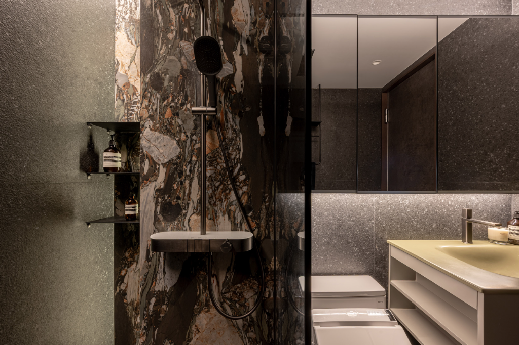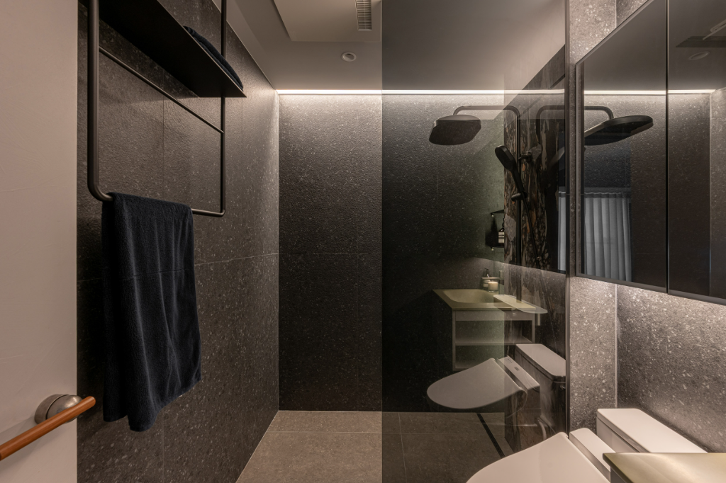 另外值得一提的是照明策略,全室以黃光為基調,搭配嵌燈與線燈,營造低亮度卻不昏暗的舒適光感。從走廊步入浴室,每一次抬頭望見牆面肌理,都彷彿與內心進行短暫交流對話,無形中達到情緒放鬆效果。再搭配橘紅壓克力、隱藏燈條與粗獷鑿面飾板,讓感官不時跳出理性邏輯之外,如性格中偶爾閃現的火光,叫人留下深刻印象。