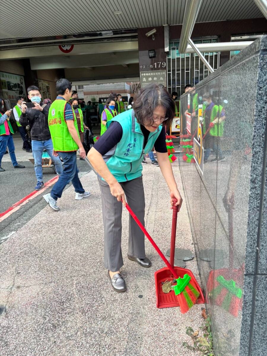 ▲高雄郵局局長尤素珍親自參與「高郵送暖、友愛社區」環境大掃除活動,帶領同仁清理街道環境,以行動落實社區關懷與防疫理念。