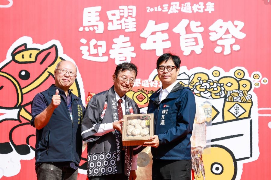 ▲日本台灣交流協會高雄事務所長奧正史配合台灣年節習俗,致贈來自日本九州的頂級香菇禮盒給高雄市長陳其邁,表達新春祝福,並展現台日友好情誼。