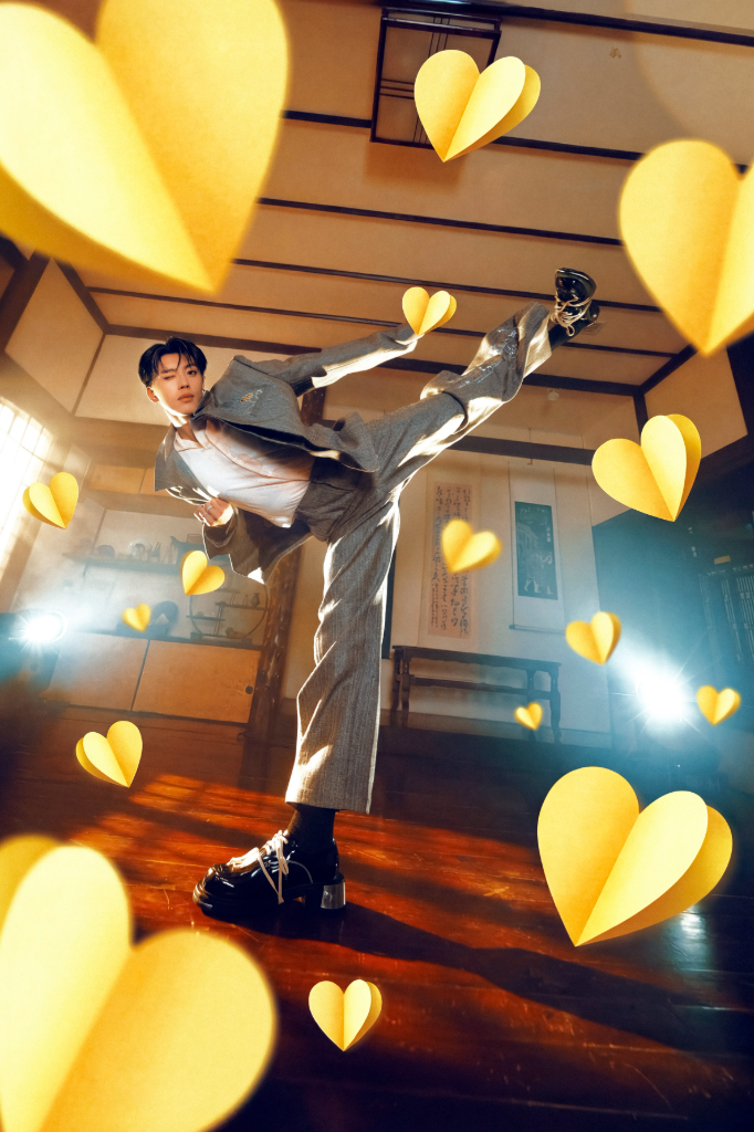 歌名〈黏踢踢〉正是有著諧音的幽默,表面看來是一種親密貼近、形影不離的狀態,像情感裡不自覺拉近的瞬間;但在這份甜黏之中,也藏著黃文廷獨有的動能與輪廓。「踢踢」不只是可愛的語感,更延伸自他最擅長的武術飛踢意象:俐落、有力,帶著身體記憶與節奏感,讓這個甜蜜的歌名,多出一條來自動作與拍點的線條。同時「踢踢」也巧妙呼應了他的英文名字Tin,讀來彷彿是黏著Tin