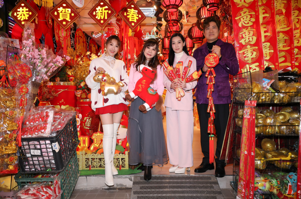 ▲ 龍千玉領軍謝金晶、楊哲、陳淑萍逛春聯大街,迎金馬好彩頭。(圖:豪記唱片)