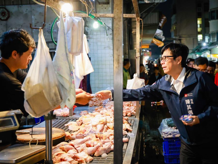 天色未亮,鳳山果菜市場與高雄果菜批發市場已人聲鼎沸,各式生鮮蔬果、肉品、熟食等商品琳瑯滿目,蔬果厚實飽滿、色澤亮眼,新鮮優質看得見。陳其邁關心販售情形,親自為攤商加油打氣,熱情的商家也親切回應祝賀,市場人情味濃厚,互動暖心。
