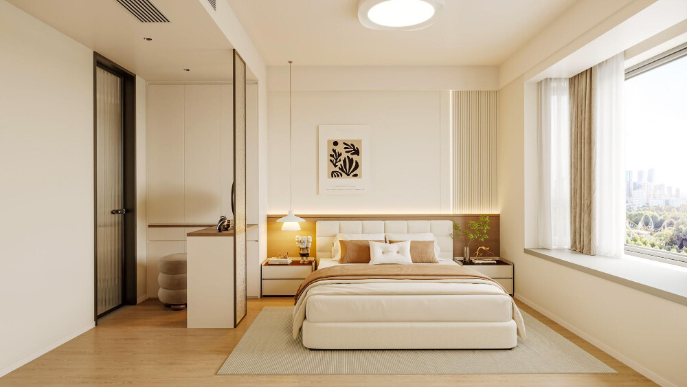 - 一體成型床頭背牆:利用木作將整面牆拉平,內部設置隔音棉,既解決風水問題,又提升臥室隔音效果。