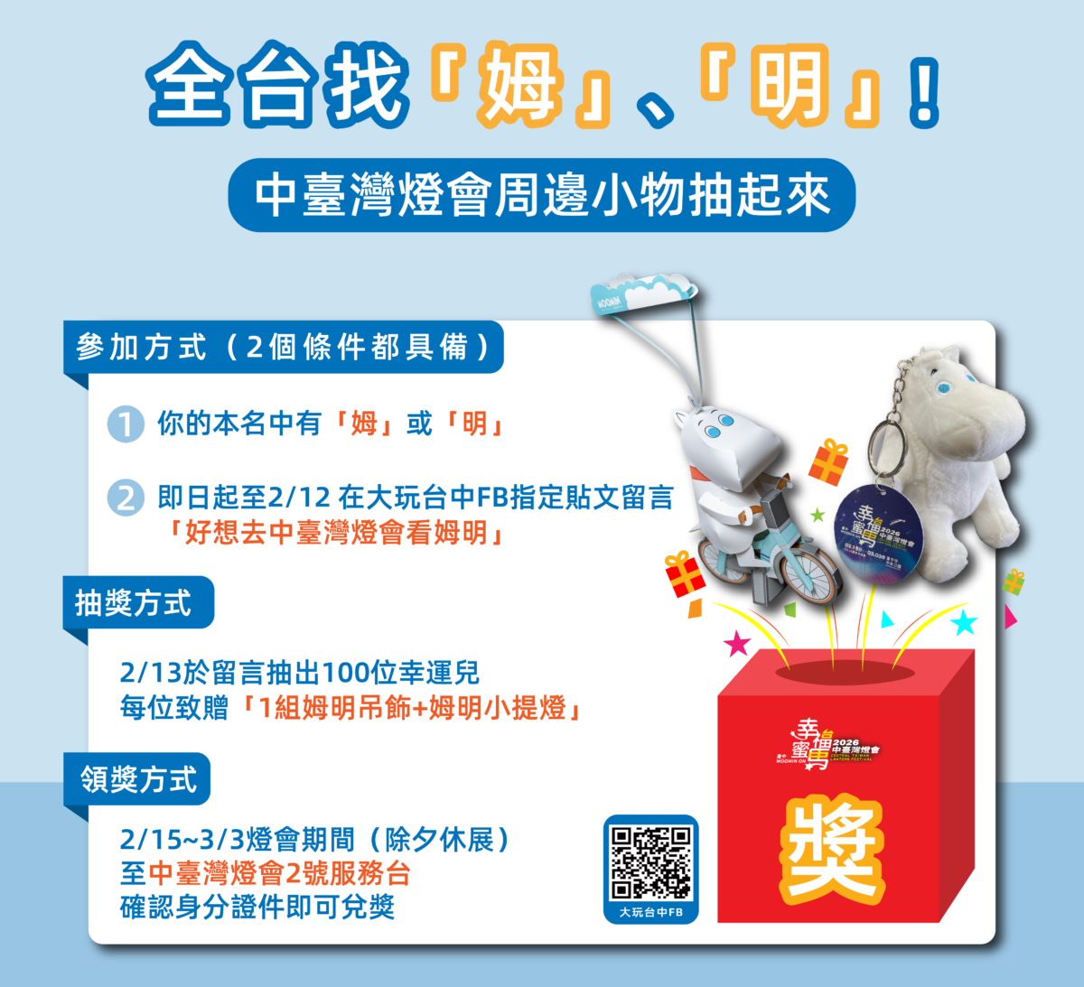 【記者 廖美雅/台中 報導】2026中台灣燈會與全球人氣IP姆明一族跨界合作,消息曝光不到一個月即引發國內外高度關注。為提前營造燈會話題與主題氛圍,台中市觀旅局推出趣味互動活動「全台找『姆』『明』」,只要本名中有「姆」或「明」,就有機會把姆明周邊帶回家。觀旅局表示,即日起至2月12日止,符合資格的民眾只要至「大玩台中」臉書粉絲專頁指定互動貼文(https://reurl.cc/eVrXGM)留言「好想去中台灣燈會看姆明」,就有機會抽中「姆明吊飾」或「姆明小提燈」,共100名幸運得主。