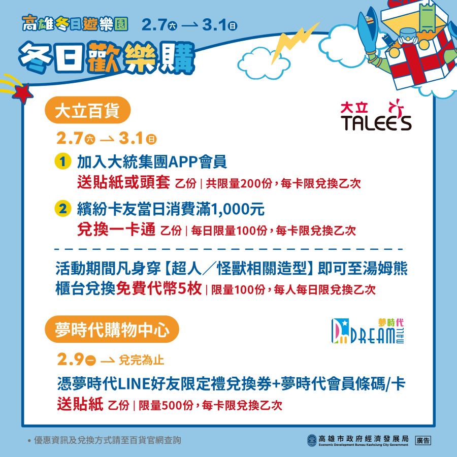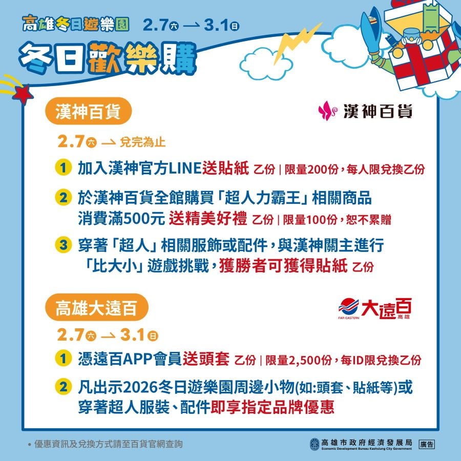 高市經發局長廖泰翔表示,高雄的冬季節慶氛圍感十足,從每年12月的聖誕生活節、跨年,一路串連至春節的冬日遊樂園活動,不僅有結合音樂策展、城市造景、國際IP的精彩連發,帶動的強大人流與經濟擴散效益,也讓高雄商圈夜市與百貨公司有感受會。繼2025聖誕生活節的「心願放大卡」後,經發局與高雄在地13家百貨公司再次聯手同慶「冬日歡樂購」活動,自2月7日起,凡是前往高雄在地各百貨公司,加入百貨指定好友,即可免費兌換冬日遊樂園限定貼紙/頭套乙份;消費滿額還可加碼兌換限定一卡通;各百貨更有各自加碼推出優惠及活動,讓民眾從愛河灣一路玩到百貨公司,享受高雄限定的娛樂體驗。
