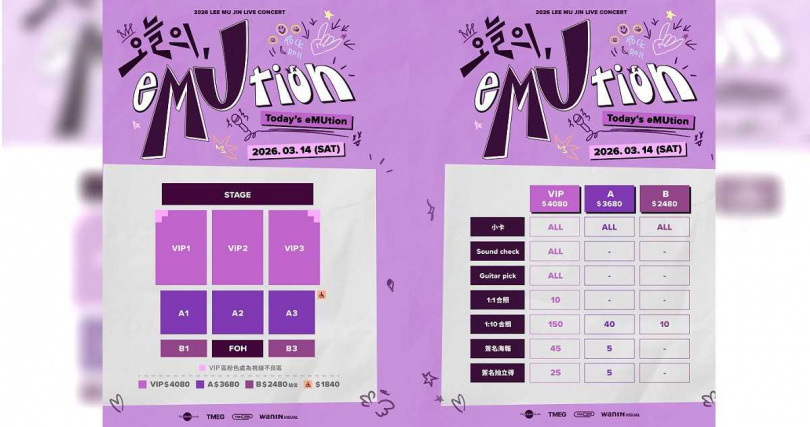 《2026 LEE MU JIN LIVE CONCERT [Today’s, eMUtion] in TAIPEI》票價依區域劃分為NT$4080、NT$3680、NT$2480,粉絲福利則是全場粉絲都能獲得台北場限定小卡,VIP區粉絲開放Soundcheck、Guitar pick,依照各區票價不同,可再抽1對1合照、1對10合照、簽名海報、簽名拍立得。演唱會門票將於2月11日中午12點在KKTIX售票網站開賣。