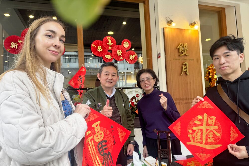 活動從上午11時起展開,濟南店外早已有等候民眾,除了本地常客,更有多組來自日本、韓國及美國的觀光客,現場多種語言交錯,雖然天氣有些冷,但客人們看著兩位書法家鋪開紅紙、墨香飄散,筆走龍蛇寫下「馬上有福」、「吉祥如意」、「金馬舞吉」等春聯字句,將字裡行間的祝福化為紙上春意,開心的笑容都溢於言表,現場民眾說:「今天來雙月喝雞湯,真的是賺到了!」