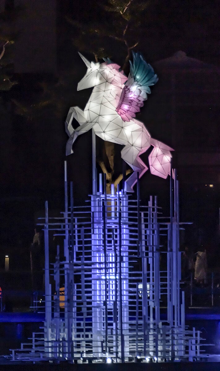 ▲今年燈節以雲端光景為主題,共展出60件作品,其中以天馬獸為主燈。(記者劉秋菊攝影)