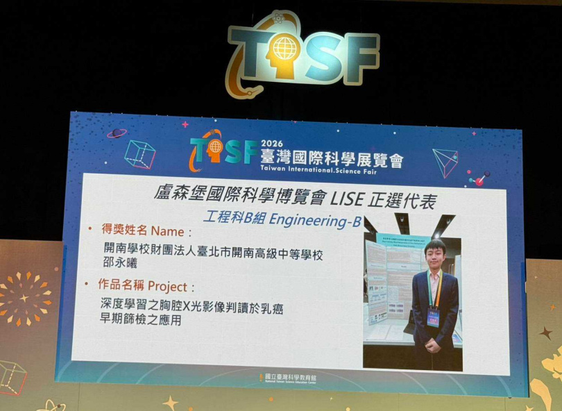 台灣國際科學展覽會(TISF)今正式公布得獎名單,來自開南商工的高一學生邵永曦,以研究題目「深度學習之胸腔X光影像判讀於乳癌早期篩檢之應用」脫穎而出,榮獲技術型高中組最優二等獎,並成功入選國手,未來將代表台灣前往盧森堡,參加國際科學博覽會,為國爭光。