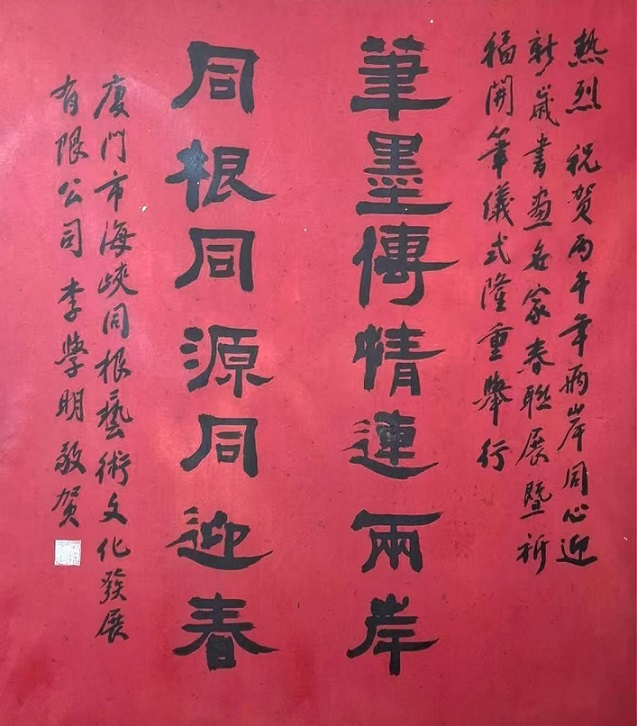 大陸協辦單位廈門市海峽同根藝術文化發展有限公司董事長李學明亦發來賀詞「筆墨傳情連兩岸,同根同源同迎春」,表達祝賀之意。值得一提的是,台灣竹筆書法傳承人洪啓義特別以傳統竹筆現場書寫春聯,展現古法書寫技藝,讓觀眾近距離感受傳統文化的魅力。