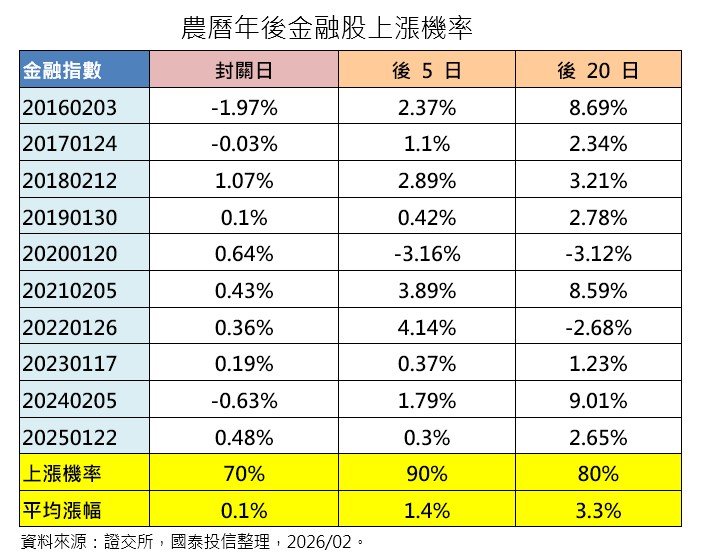江宇騰強調,2025年上市13家金控稅後盈餘總計5863.2億元,今年金融族群的配息表現有望再添高度競爭力,極具期待空間;而從歷史數據觀察,金融股在農曆年後往往具備較強的補漲動能與上漲機率,隨著年後資金回流,法人普遍看好金融類股的評價修復行情。