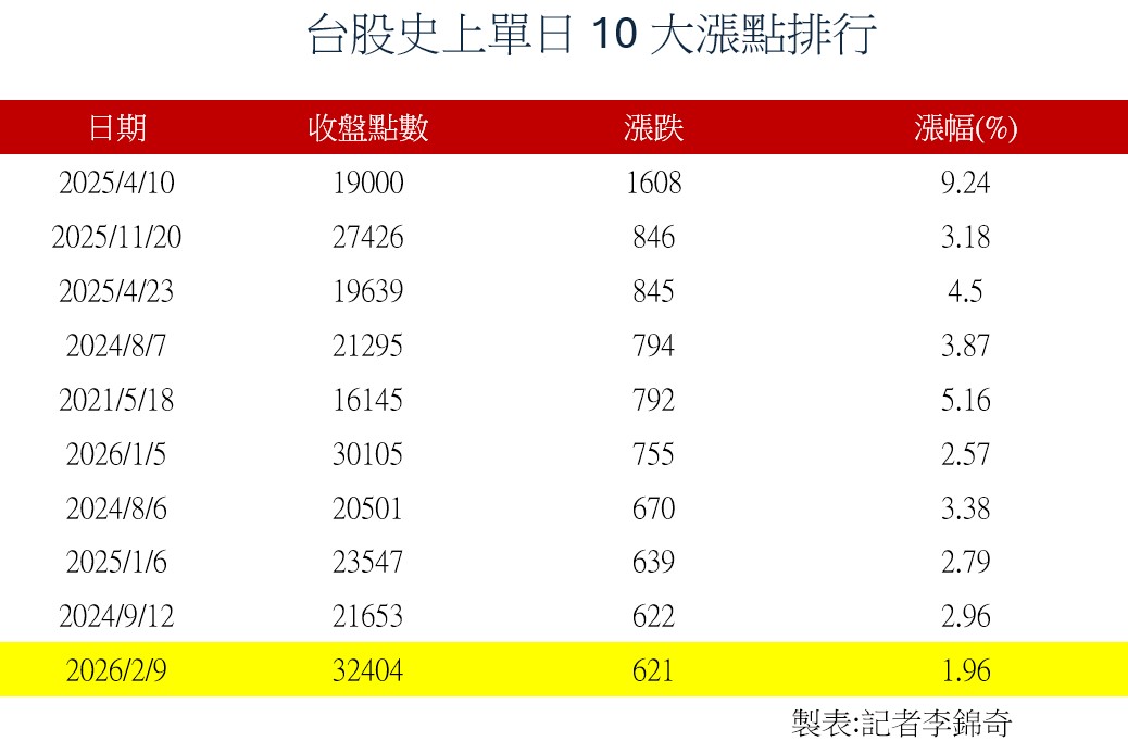 美股上週五大漲,費城半導體跟台積電ADR更飆漲逾5%,帶動台股今天盤中狂噴883點,收盤仍大漲621點,收在3萬2404點,漲幅1.9%,改寫史上單日第十大漲點。