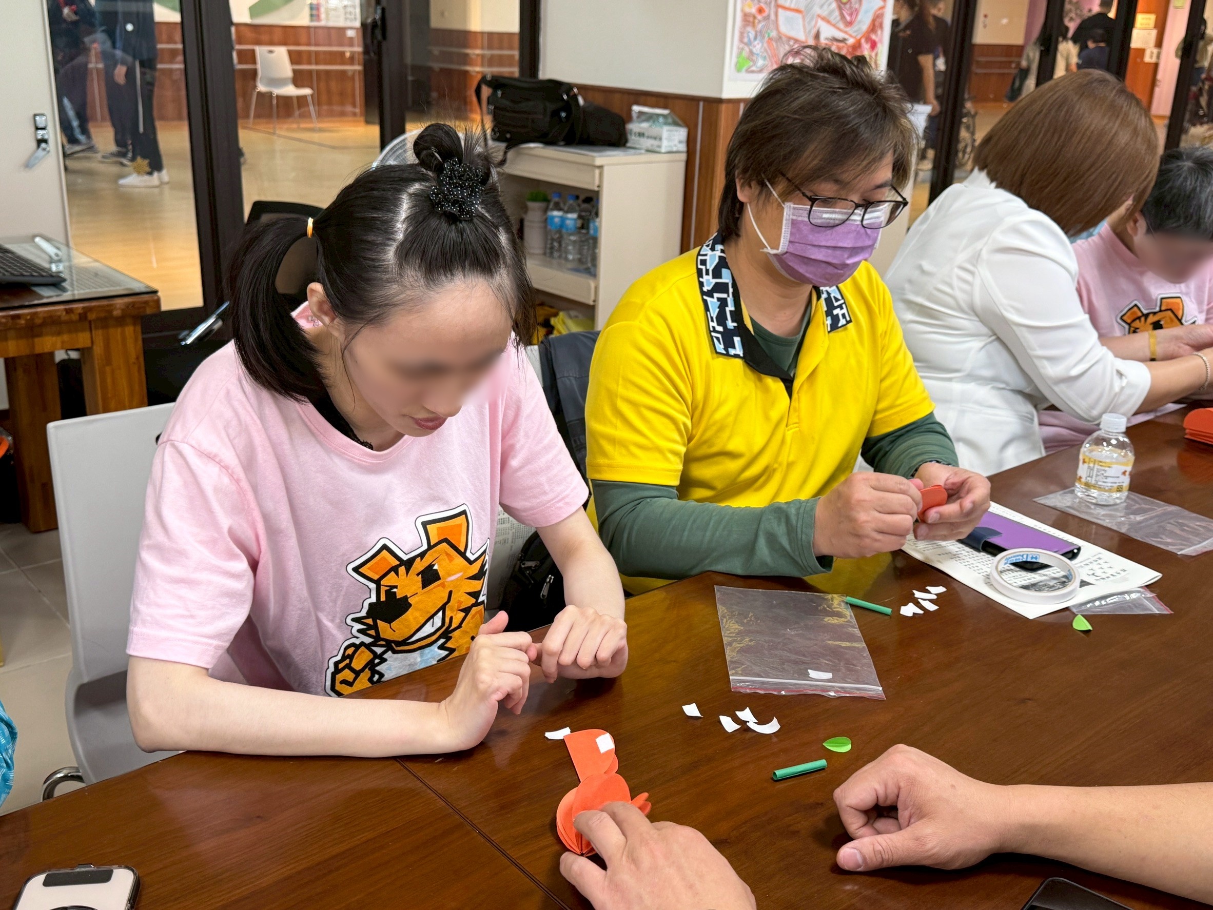 活動當天,扶輪社友化身志工,耐心陪伴住民完成立體紙藝橘子創作。過程中,有人因動作較慢或肢體限制,難以完成細部步驟,志工們一對一引導、協助剪裁與黏貼,讓一張張色紙逐漸變成立體橘子,再貼上象徵吉祥的「福」字,現場洋溢歡笑與成就感。