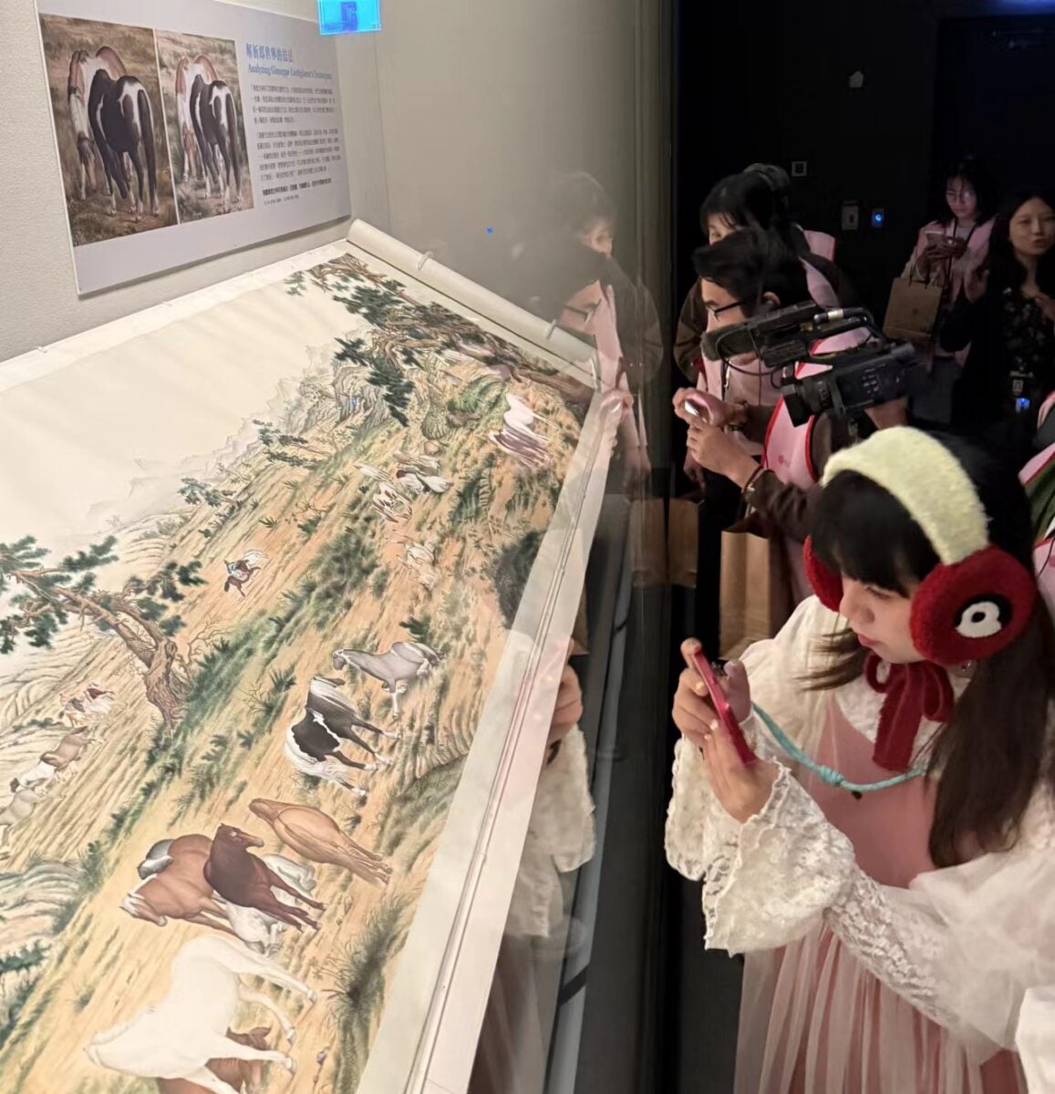 展覽中以郎世寧〈百駿圖〉為重要參照,透過相關圖像與說明,解析繪畫中融合西方透視與明暗渲染的手法,如何形塑畫面縱深與馬匹肌理,數位展示〈古畫動漫—百駿圖〉動畫展演呈現畫中駿馬的生態,與書畫文物形成有趣的對照;民國畫家馬晉於1923年摹繪〈百駿圖〉,以傳統工筆結合西洋明暗設色,展現近代畫家對宮廷畫風的再詮釋,亦反映「郎派」已被視為中國畫傳統的一部分。展覽並梳理歷代馬畫常見主題,如天馬、貢馬、瘦馬、番馬與人馬,呈現馬畫題材在文人精神與歷史境遇中的多重意涵。
