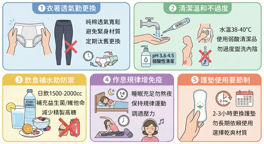 1. 衣著透氣勤更換:內褲宜選擇純棉材質並定期汰換,室內或睡眠時改穿寬鬆衣物,盡量縮短緊身褲、厚褲襪的穿著時間,並保持私密處乾爽通風,也能減少細菌孳生的機率。