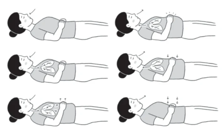 - 仰躺,全身放鬆,兩手放在肚臍上,閉著嘴巴,用鼻子慢慢吸氣。