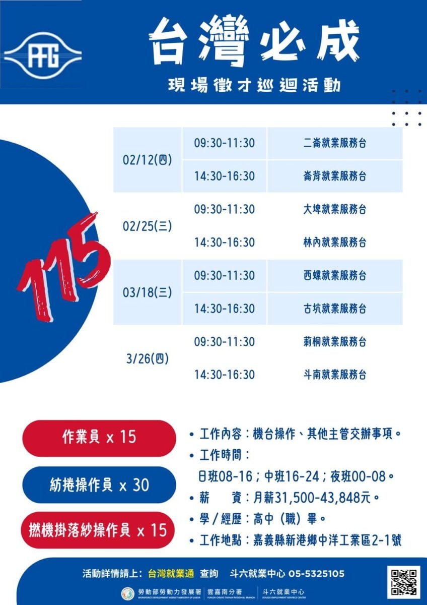 劉主任補充,斗六就業中心後續也將辦理「台灣必成股份有限公司」現場徵才巡迴活動,分別於2月12日、2月25日、3月18日及3月26日,陸續在二崙、崙背、大埤、林內、西螺、古坑、莿桐及斗南等8個轄內就業服務台辦理,招募作業員、紡捲操作員及燃機掛落砂操作員等60個職缺,起薪 3.15萬元。歡迎有就業需求的民眾把握機會、就近參加面試,相關活動資訊可致電斗六就業中心(05)532-5105洽詢或上「台灣就業通」網站查詢。