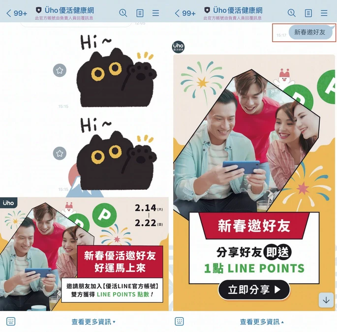 只要在2月14日(六)至2/22(日)過年期間邀朋友加入【優活LINE官方帳號】,您和朋友雙方都能立即獲得LINE POINTS點數!分享越多,好康越多,讓這個新春充滿驚喜與回饋!