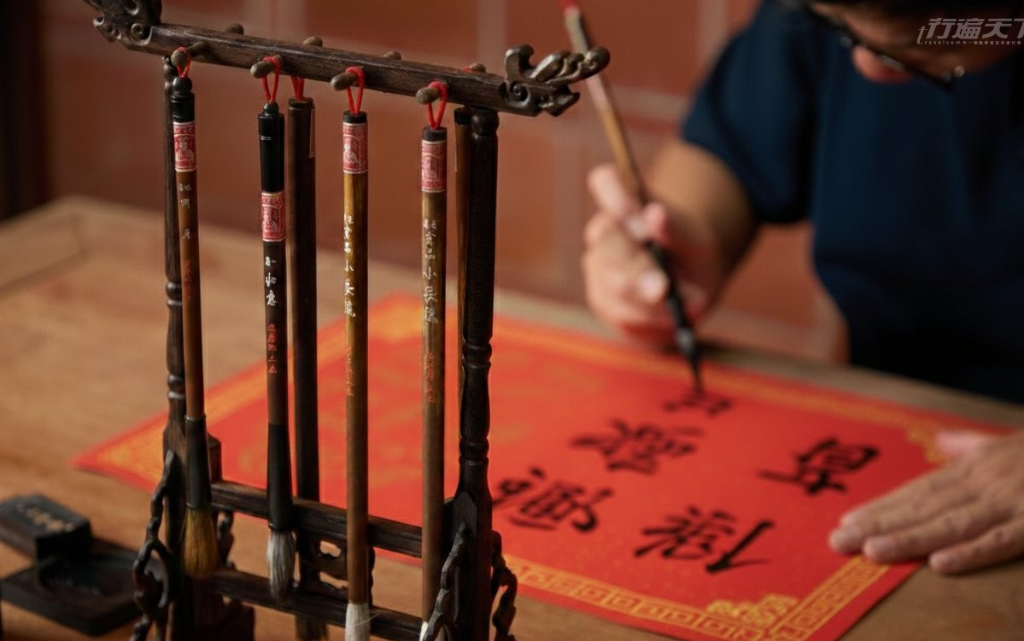 ▲ 春節期間遊客可在竹林院落中,執筆書法題春。(圖片提供:The One南園)