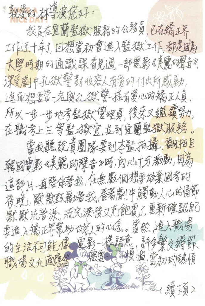 同時林孝謙也特別感謝宜蘭監獄所提供的場地和拍攝的支援,在過年前他也率領安心亞一起參加宜蘭監獄的映後座談,得到了許多的鼓勵和溫暖回饋。導演也接到了一位宜蘭監獄服務的公務員,她在10年前看過《美麗的聲音》而受到激勵後努力想要成為一名跟孔獄警對收容人有愛心的矯正人員,也提到這部電影時時陪伴著他國考的夜晚,現在已經在矯正界工作了10年也遇到許多職場文化適應和煩惱,但是他感謝導演拍出這部《陽光女子合唱團》的好電影,讓更多人看見這個美好故事。