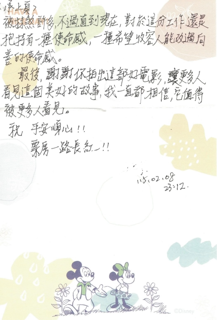編劇呂安弦也提到自己在田野調查的時候因為一位送出養的收容人,在面對法官詢問是否確定要把自己親身小孩送養時,她聲淚俱下說出:「確認」時,感受到愛與悲傷同時存在,這也成為觀眾在看陳意涵送出芸熙時最催淚的部分了!陳意涵本身也提到了:「非常開心大家很喜歡這部電影,在拍攝期間也是非常開心也充滿愛,這份愛可以傳遞那麼遠,讓那麼多人知道,真是非常地榮幸,比任何事情都還要讓我開心!」翁倩玉則提到:「我離開台灣電影47年之後,能得到這麼多人的喜愛,這麼多的支持,我很感謝,這部電影給我很大的message(訊息)就是:媽媽的愛!」