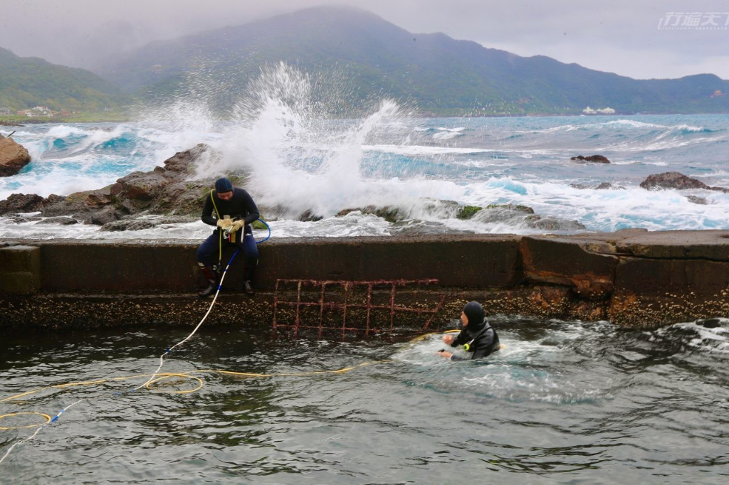 ▲ 貢寮海漢子採收九孔通常是東北角風浪最大也最冷的季節,他們下水採收常會暈浪或凍到嘴唇僵直,連續幾小時工作後拆下面罩,往往在臉龐留下深深印記。