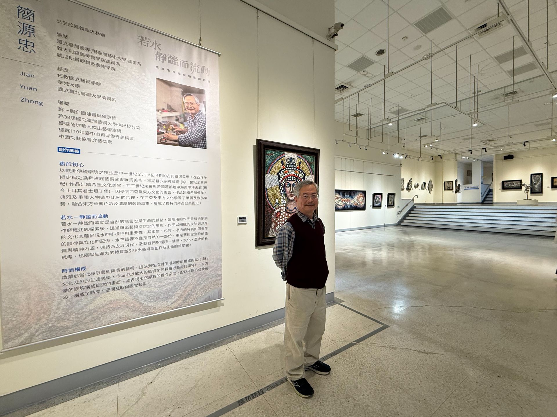 《若水・靜謐而流動簡源忠多媒材鑲嵌創作展》現於 大墩文化中心 盛大展出,呈現藝術家跨時期、跨媒材的卓越創作能量。擁有豐富展覽資歷的 簡源忠 將不同時期作品集結呈現,包括大型創作,氣勢磅礴、雄偉,橫跨時空,充分展現在地精神與西方藝術融合的動人實驗性。透過玻璃、陶片、石材、琉璃、琺瑯及複合材質的巧妙拼貼,觀者可在光影交錯、色彩流動中感受時間的韻律與視覺的震撼。