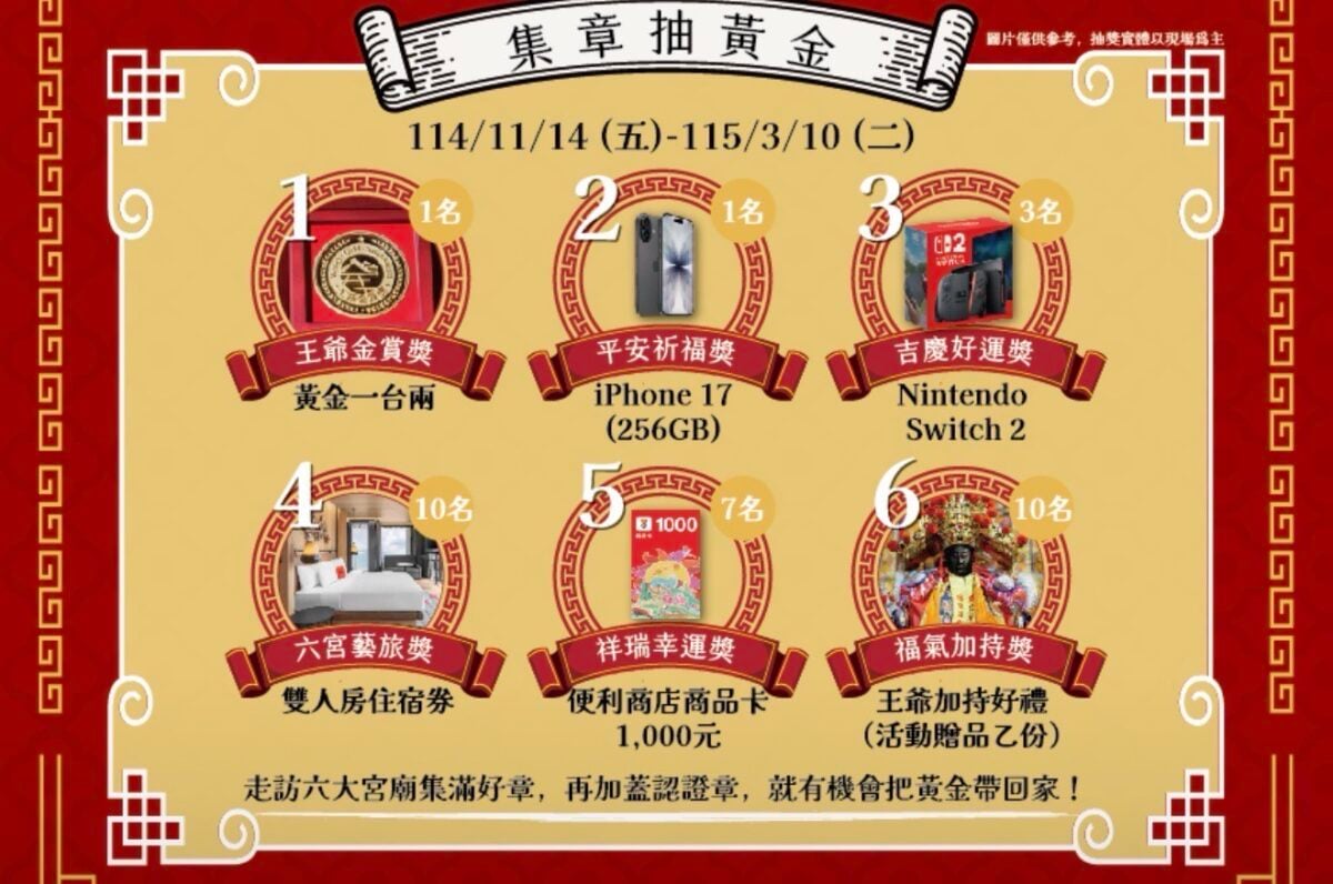 除單日活動外,「北門王爺藝饗節」同步推動的「六宮祈福集章遊」亦成為現場民眾關注焦點。民眾於活動期間走訪北門六大宮廟蒐集祈福印章,完成指定集章流程並投入摸彩箱,即可參加抽獎,最大獎為黃金一台兩。徐振能處長說藉著集章結合抽獎活動,成功帶動民眾規劃多日走訪北門,延伸至井仔腳鹽田、北門聚落與周邊景點,形成結合信仰參拜與濱海旅遊的走春動線。民眾可於北門王爺藝饗節系列活動期間,依自身行程彈性安排參與,並於北門遊客中心或各場活動現場完成認證章蓋印,趕緊把握抽中黃金一台兩的機會。