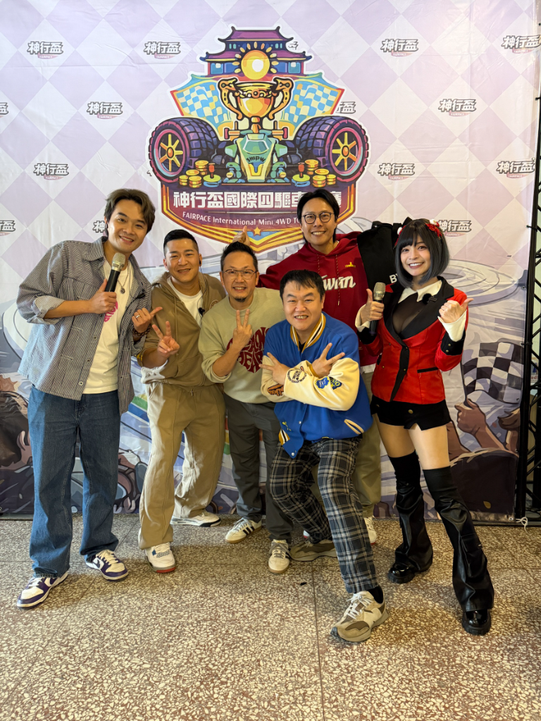 ▲ (由左至右)柯大堡、草爺砸重金,斥資七位數,舉辦第一屆「神行盃國際四驅車大賽」文化總會秘書長李厚慶、youtube「看你老墓」司徒建銘、港仔台爸張啟樂、郭鬼鬼都前來力挺。(圖:紅心字會)