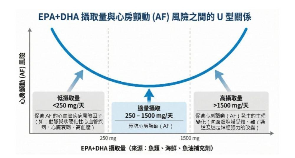 《VegiWell 植悅》營養師施姍伶引用《美國心臟協會期刊》最新發表的研究指出,Omega-3 的攝取與心血管健康(特別是心房顫動風險)呈現的「U型關係」。數據顯示,EPA與DHA每日攝取 500至700毫克 的區間,對於心血管健康的效益較佳 。