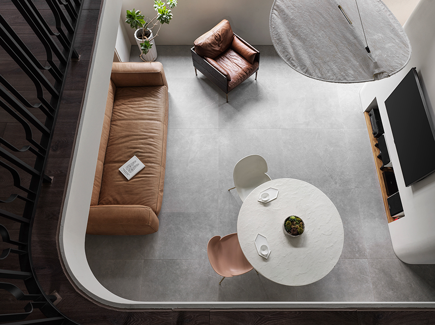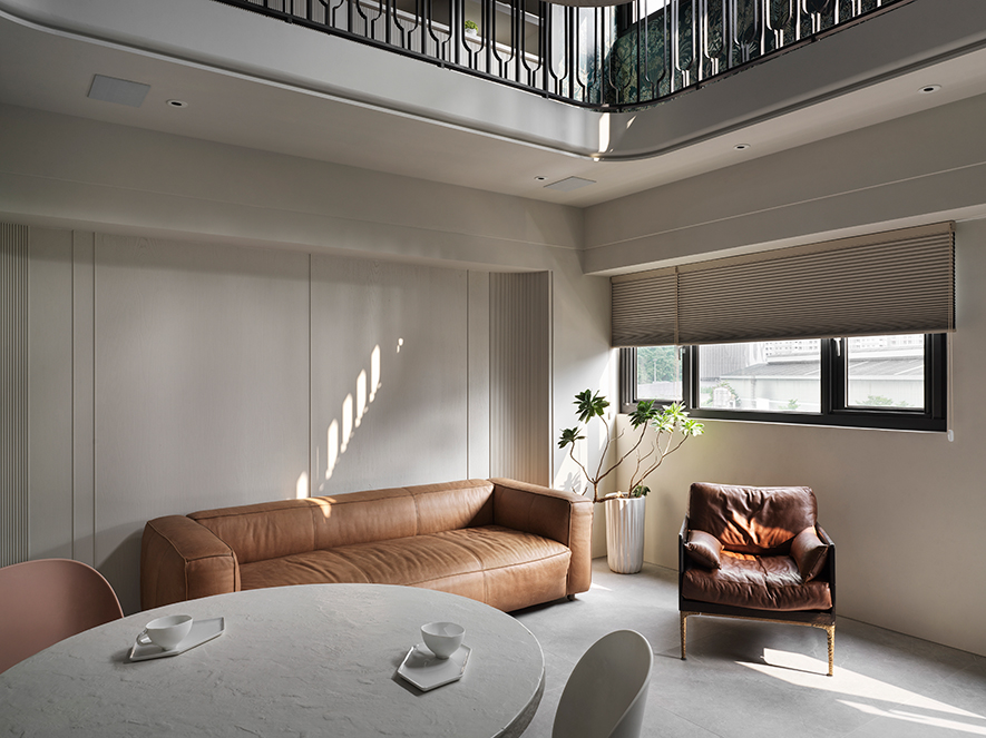 客餐廳地坪鋪設灰色石紋地磚,搭配四面環繞帶有淨白木紋、仿水泥紋理漆料的樸實觀感,呈現低調靜謐的灰調侘寂風,輔以二樓垂掛而下的紙質吊燈,以及具板岩斑駁質感的素朴餐桌等精選家具,進一步彰顯大自然粗糙而不完美、卻幽靜簡雅的日系美學,更選搭跳色的暖橘餐椅與真皮沙發,調和大片灰石材質的冰冷主調,為此區注入溫潤舒適的放鬆氛圍。