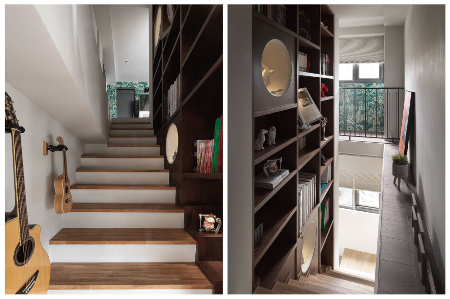 頂天電視牆不僅作為公領域與樓梯間的區隔,也利用後方牆面創造木韻滿溢的書牆與收納展示區,配合對面鋪設木質地坪、成為展示平臺的橫樑,與樑下樂器牆的劃設,使原本僅是過渡區的單調走道,轉作一座和暖舒愜的藝廊,隨著每日生活變化,輕鬆更換兩側的佈置擺飾,成為一家人積累回憶時光的長廊,為日常增添藝術品味與情感連結。