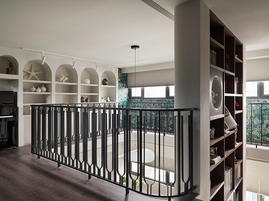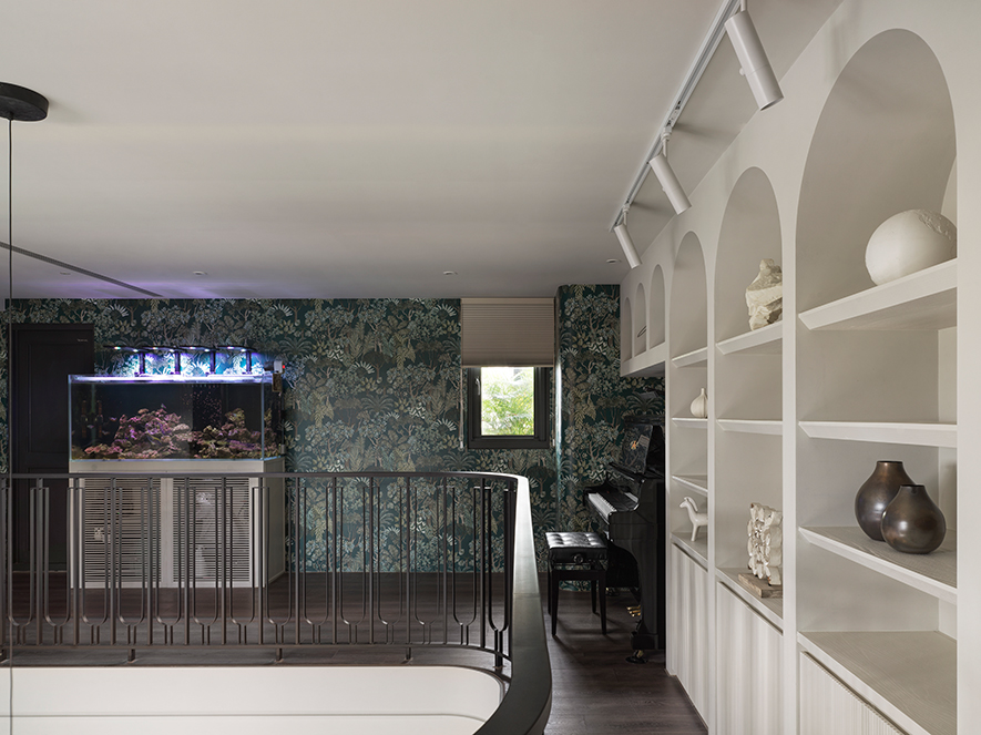 開放式雙層設計的採光優勢,令戶外流瀉的自然煦光充盈夾層,點亮弧形鐵件欄杆的洗鍊細緻,及潔白拱型收納牆的柔曲優雅,描繪如英式花園的高尚典雅意象。周圍壁面選用花卉圖樣壁紙,包裹女主人細心照料的海水魚缸,綠意與海藍交織清新而略帶神祕感的氛圍,將大自然的生命力引入家中,激發孩子們無窮的想像力。於此,鋼琴樂聲與魚群悠游的粼光掠影相伴,空間在藝術與自然之間流動,讓生活多了幾分詩意及童趣,更圍塑一方家人共享的療癒場所。