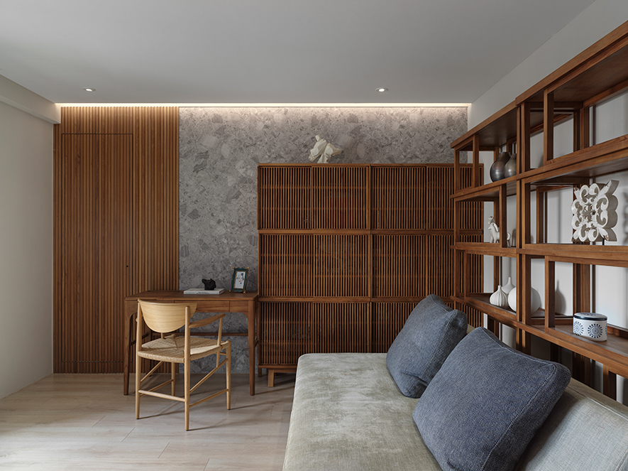 需兼具主臥及書房功能的此區,選配柚木家具及木質格柵奠下柔潤調性,恰如禪景中的細水盆景潤澤石面,化解灰階石牆的冷硬感,佐搭間接燈光輕灑於層架與書桌的溫潤,在靜寂中抹上原木淡淡的人文溫度,予以夫妻二人屏去繁複裝飾、圍繞天然大地色系的沉心場域;當書香與木石相融,空間彷彿自內而外吐納悠遠平和之氣息,營造舒緩身心的理想所在。