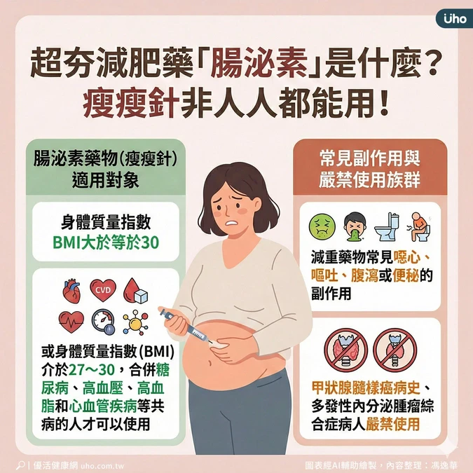 沈逸婷指出,雖然藥物能輔助減重,但並非人人適用,「熱門的瘦瘦針適應症是對身體質量指數BMI大於等於30,或身體質量指數(BMI)介於27~30,而且有糖尿病、高血壓、高血脂和心血管疾病等共病的人才可以使用。」但這類減重藥物常見噁心、嘔吐、腹瀉或便秘的副作用,若有甲狀腺髓樣癌病史、多發性內分泌腫瘤綜合症病人嚴禁使用。