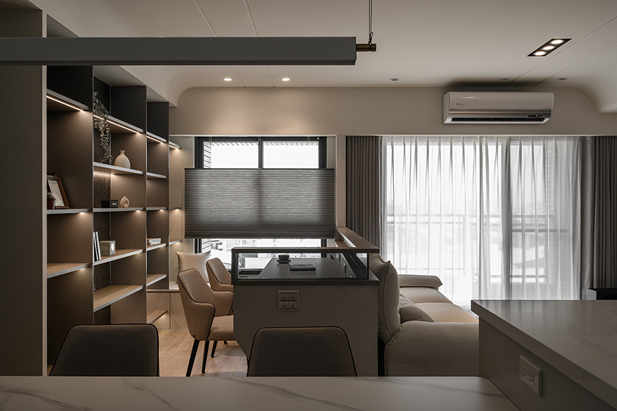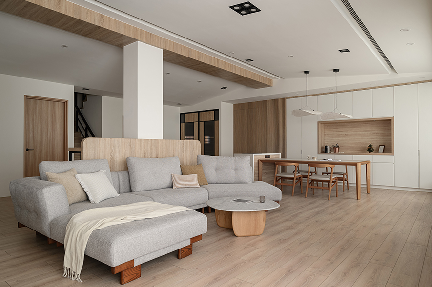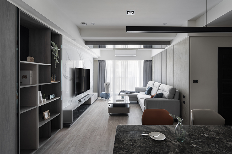 或許是經歷那段忙亂又深刻的日子,如今當總監面對家中有孩子的業主時,那股「父母心」自然就流露在設計細節中,像在公共空間增加弧角收邊、選擇安全友善的材質、刻意放大客廳的活動範圍,以至於連茶几的尺寸、決定擺放與否,都會以孩子的未來動線為前提。「我自己也知道,小朋友在家就是一直跑、一直跳,難免撞來撞去。能讓父母少擔心一點,當然是最好的。」