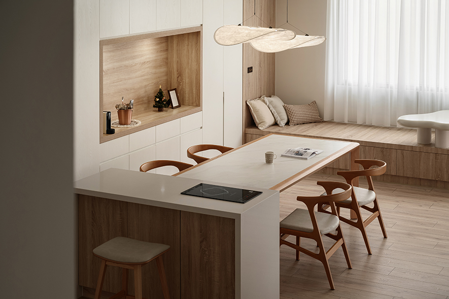 「無論趨勢如何轉變,以木元素的溫潤柔化設計,並帶予客戶觸動心弦的溫柔空間,永遠都是我們最重視的核心。」曾智和總監處於變遷不斷的時代洪流中,身肩公司領導者重責、亦為人父的他,卻總能堅定履行初心,讓設計理念不單作為精神標語,而是融匯團隊不斷精進的專業功力、家庭帶來的溫情力量,徹底落實於自發想至竣工的每處細節,成就每件作品中,那份洋溢棠禾設計獨到的木調暖意。