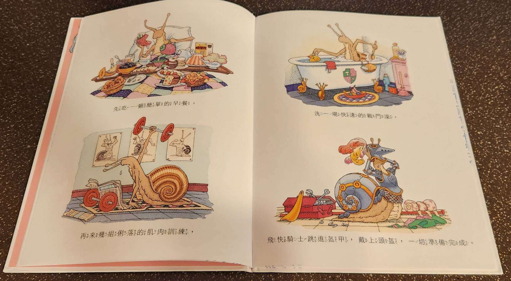 今天跟鄰國蝸牛大軍有一場無情又暴力的大戰要打!但圖像上是溫馨的房間,妻子抱著他,成了強烈對比,唯一看得出的是飛快蝸牛緊張的表情,有趣的是第二頁四格圖像,明明就來不及了,但他仍堅持地完成起床後的每件事,一樣是文字圖像上讓人好氣又好笑的反襯,準備好要出發了,結果……又是一陣拖磨,但每一個所謂的拖拉,對飛快蝸牛而言,都是必要且重要的事。