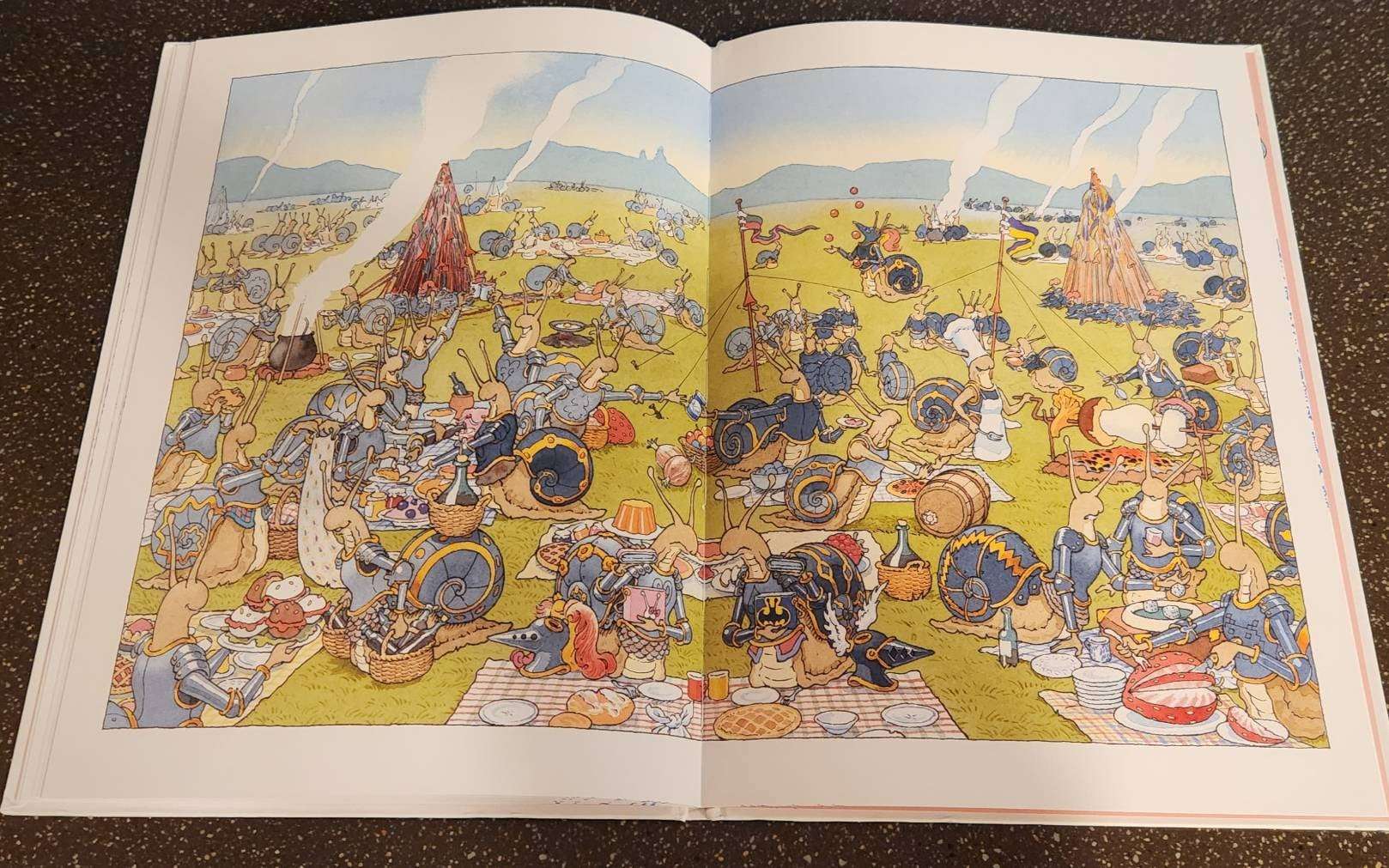 可想而知沿路過程中,又發生好多事,終於抵達戰場,但是午餐時間到了,哈哈哈,整幅誇頁沒有文字的圖像上,我們看見兩軍人馬像是大型野餐活動,臉上充滿笑意,此時真的有一種「皇帝不急,急死太監」的感覺,不是要一決生死嗎?結局留給大家找書來看。