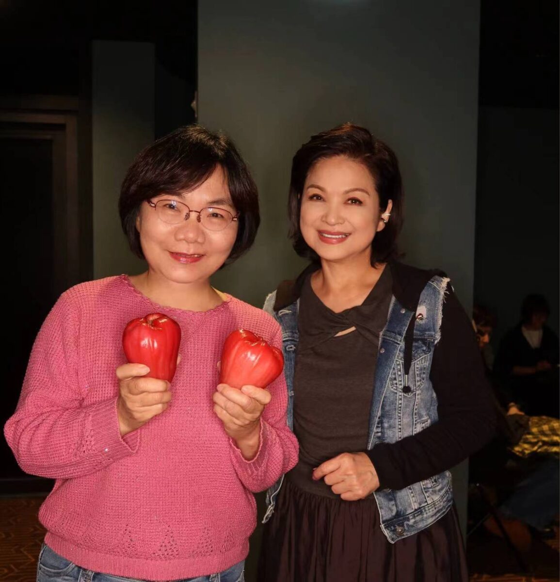 ▲楊貴媚在影城包場請看《雙囍》電影新作,媒體友人陳淑芬(左)送上大蓮霧祝賀「雙喜臨門」。(陳怡汝攝影)