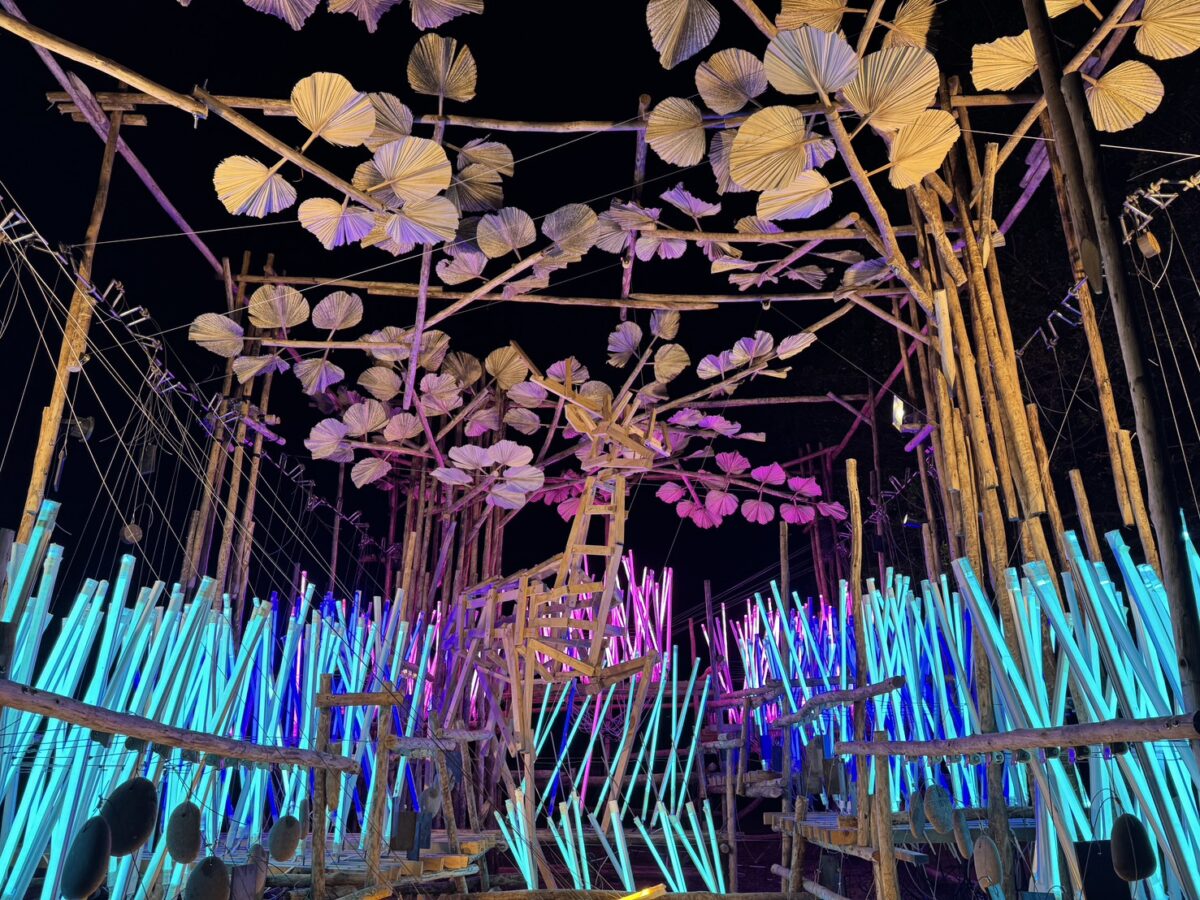在整體光環境規劃上,本屆策展思維更趨成熟,山林不再只是作品的背景,而是主動發聲的展演場域。光環境作品《聲波》以超過150支光環燈條環繞虎形山公園,透過節奏與流動感,讓森林成為創作的一部分,形塑山林與光影共構的空間敘事。