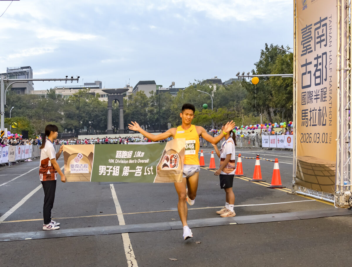 ▲2026臺南古都國際半程馬拉松10K男子組林哲緯奪冠。(記者劉秋菊攝影)
