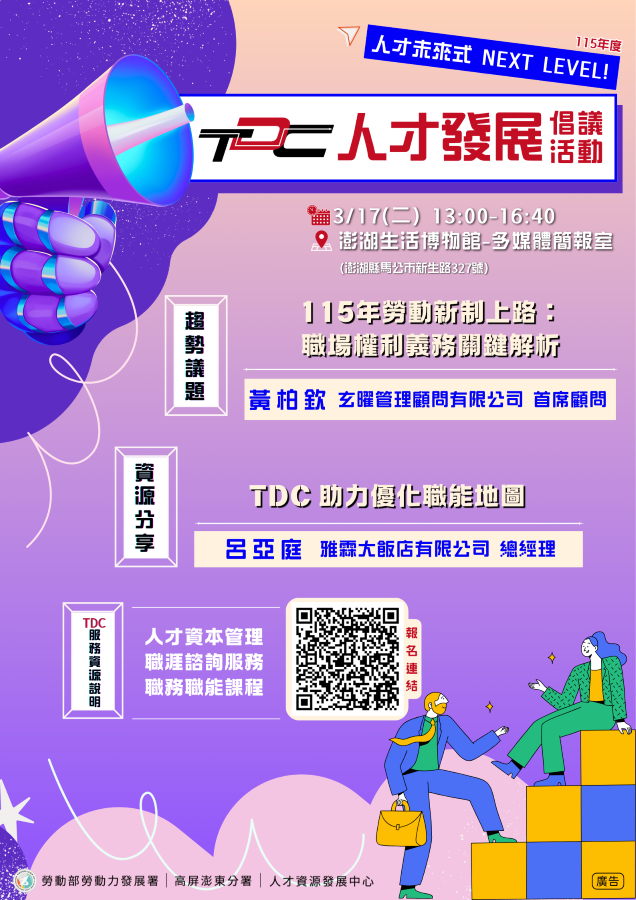 【記者 王雯玲/高雄 報導】勞動環境隨社會需求持續演進,為協助企業因應115年度多項勞動法令新制上路,勞動部人才資源發展中心將於3月17日(星期二)於澎湖生活博物館舉辦「人才發展倡議活動」,聚焦勞動法令新制重點整理與人才制度優化實務分享,協助企業強化法令遵循能力,並同步健全內部管理制度。