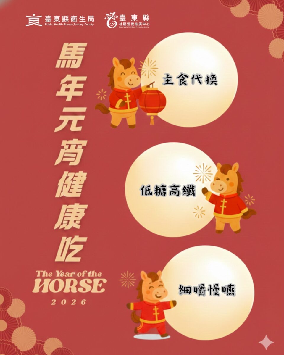 【記者 朱達志/台東 報導】元宵佳節熱鬧登場,賞寒單、吃元宵是許多臺東民眾的應景活動。但您知道嗎?看似小巧的一顆元宵,熱量卻直逼100大卡,一碗包餡元宵甜湯的熱量,約等同一個市售的滷雞腿便當,若攝取過量,恐增加肥胖與代謝症候群風險。為讓民眾安心過節、健康不打折,臺東縣社區營養推廣中心推出「馬上健康吃三招」,教大家聰明吃元宵。
