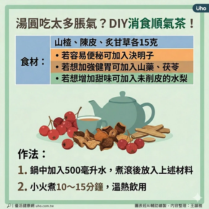 林亞萱說明,針對節慶飲食過量、輕度消化不良的情況,可藉由「敲敲操」幫助消化,協助調理腸胃蠕動、防止便秘;此外,也可以透過「消食順氣茶」來促進消化,可作為飲食調整的輔助選擇。