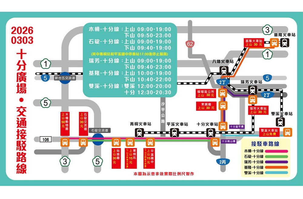 另外,明天已規劃5條接駁路線:「木柵動物園—國道5號石碇交流道—姑娘廟—菁桐坑—平溪國中—十分南山橋」,約5至10分鐘一班。「國道5號石碇交流道—姑娘廟—菁桐坑—平溪國中—十分南山橋」,約10至20分鐘一班。「瑞芳火車站—十分基平橋」,約10至20分鐘一班。「基隆火車站—暖暖區公所—東興廟—十分基平橋」,約15至20分鐘一班。「雙溪火車站—十分基平橋」,約30分鐘一班。