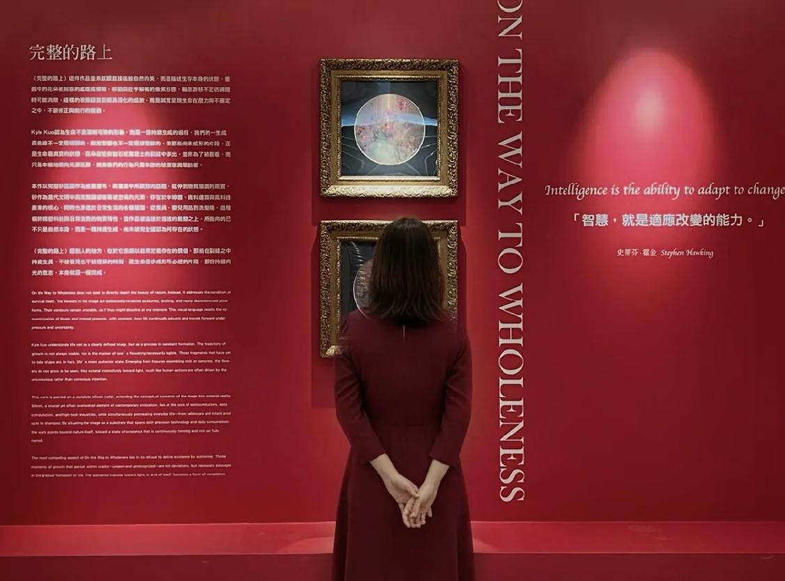 本次展覽 《Cracks of Vitality|裂縫生機》是藝術家 Kyle Kuo 郭子豪的個展,主要展出作品是全球首位以矽晶圓作為多媒材畫布,於 2026 年創作的全新作品 〈完整的路上〉,作品畫面中的花朵被刻意處理為模糊、移動、近乎解構的像素形態,輪廓游移不定,彷彿隨時可能消散,拒絕浪漫化的盛放,轉而呈現生命在壓力與不確定之中,不斷修正、前行的真實樣貌。