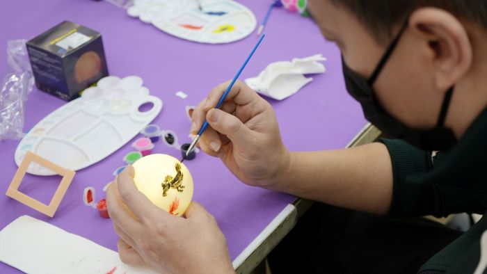 活動中,病友陳先生(化名)專注描繪燈面圖案,在溫馨愉悅的節慶氛圍中,一筆一畫勾勒屬於自己的月光。對他而言,這不僅是完成一件作品,更是一場真實而溫暖的互動體驗。當燈光亮起,一盞盞柔和月光映照在眾人笑容之中,也為醫院空間增添濃濃年節氣息。