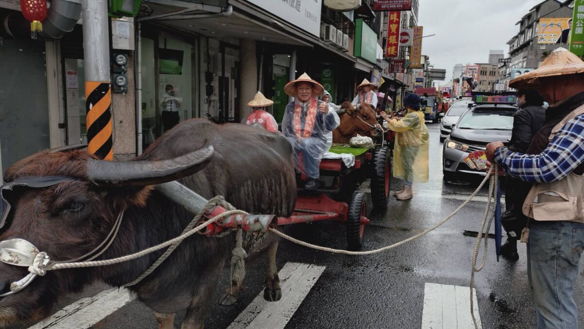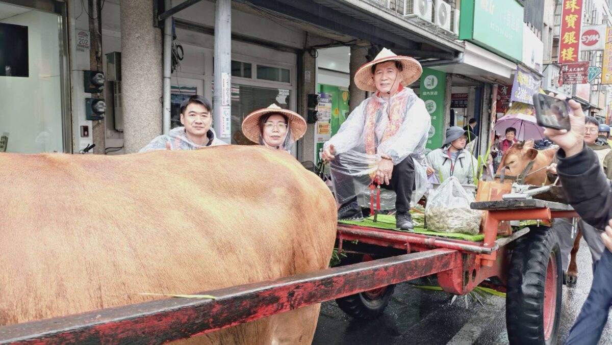 ▲代理縣長林茂盛坐水牛車繞市區祈福。